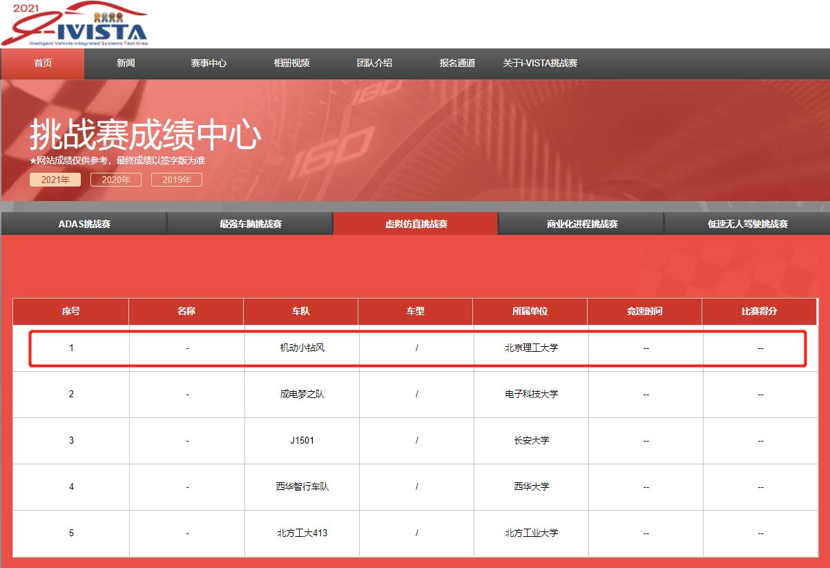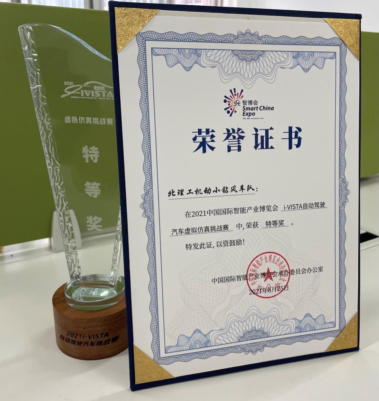 8月19日至22日,由中国国际智能产业博览会组委会主办的第四届2021 i-VISTA自动驾驶汽车挑战赛在重庆两江新区举行,我院何洪文教授指导的刘文婕、贾淳淳、张奎三位研究生组成了机动小钻风车队参加了虚拟仿真挑战赛项目,以决赛第一名的成绩荣获了2021 i-VISTA自动驾驶汽车挑战赛虚拟仿真挑战赛特等奖。